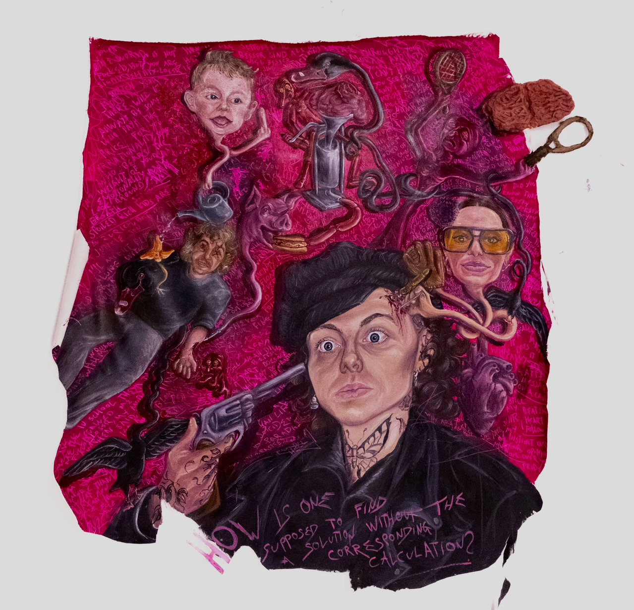 oil, tag marker and clay on canvas